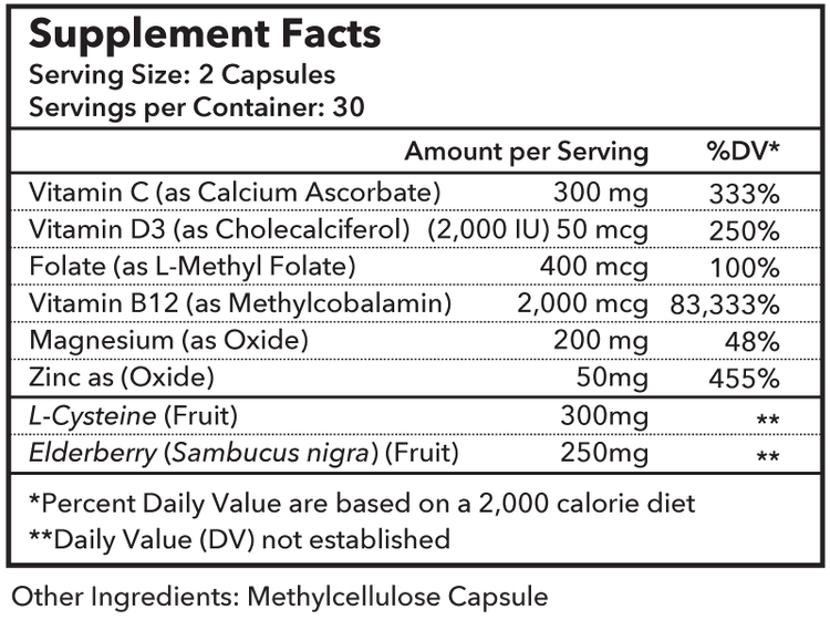 These essential vitamins and natural fruits are extremely good for your immune system and provide a natural defense against viruses. Vitamin C with its lymphocyte boosting nature, vitamin D3 with its role in immune function, and folate and l-cysteine with their anti-inflammatory properties are essential for your good health. Elderberry and zinc have been shown to provide immunity, especially against colds and flu.