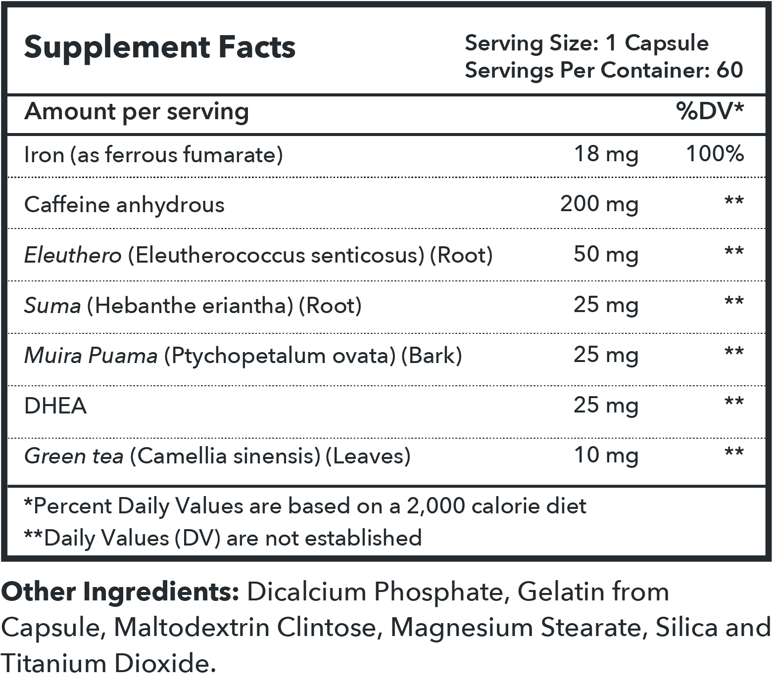Energy Complete's science-backed formula is powered by a potent blend of natural ingredients. Green Tea Extract, rich in antioxidants like EGCG, supports heightened energy levels and metabolic function. Studies suggest it may boost energy expenditure, aid in fat oxidation, and enhance exercise performance. Eleuthero Root, utilized in traditional Chinese medicine for its adaptogenic properties, is shown to bolster stamina and mental performance, particularly during stressful conditions. Suma Root, known as Brazilian ginseng, contains bioactive compounds that support physical endurance, recovery from exercise-induced fatigue, and immune function. Muira Puama Bark, sourced from the Amazon, exhibits aphrodisiac and tonic properties alongside neuroprotective and energizing effects. Additionally, Iron as Ferrous Fumarate plays a pivotal role in oxygen transport, combating fatigue and sustaining energy metabolism. DHEA, a hormone precursor, has been associated with increased energy, mood enhancement, and improved physical and sexual performance, offering comprehensive support for vitality and well-being.