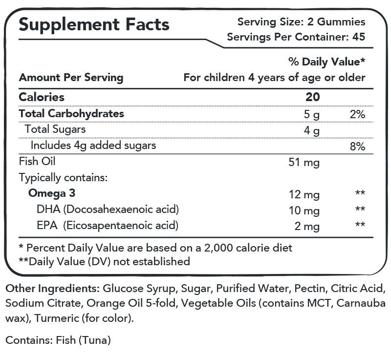 Upsy Daisy Kids Omega 3 is made from quality sourced ingredients. Each gummy has fish oil which contains: